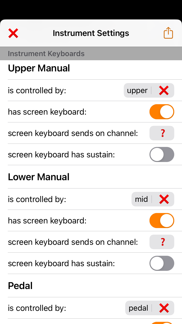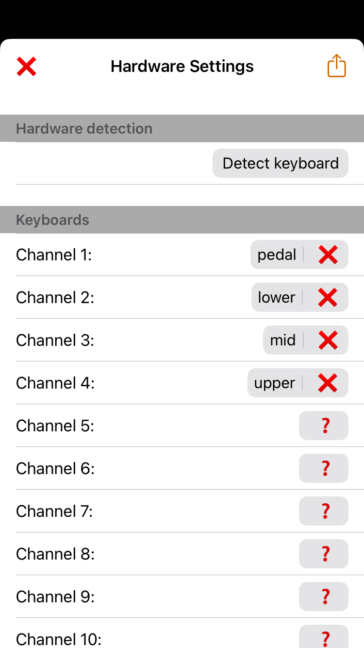 You can enter a MIDI keyboard manually by giving a name to the MIDI channel that it sends on. This is done by tapping the question mark or a previouly created name. Or you apply the automatic detection with Detect keyboard. For this, a key of the MIDI keyboard must be pressed, followed by entering the name.