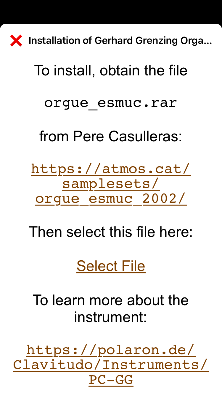 After tapping the URL for retrieving the sample set, the page is opened in the web browser. There, download the file and drop it at a place of your choice. Following, with Select File you can select the file for the installation, and, after confirmation, perform the installation. Afterwards the instrument is represented by an icon in the administration view: