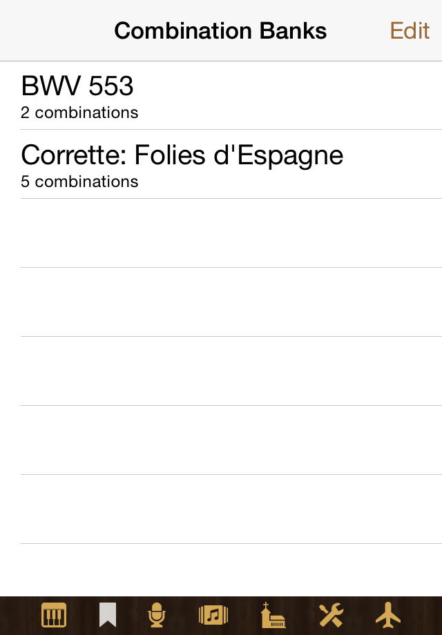 If you would like to edit combination banks, i.e. create a new bank, or create or duplicate combinations in it, or move a combination from one bank to another, then tap the Edit button in the top right of the view. This brings up a grouped list of the combination banks and their combinations. You can also tap at a combination bank in the main view – then the grouped list will be scrolled to show the selected bank and its combinations.