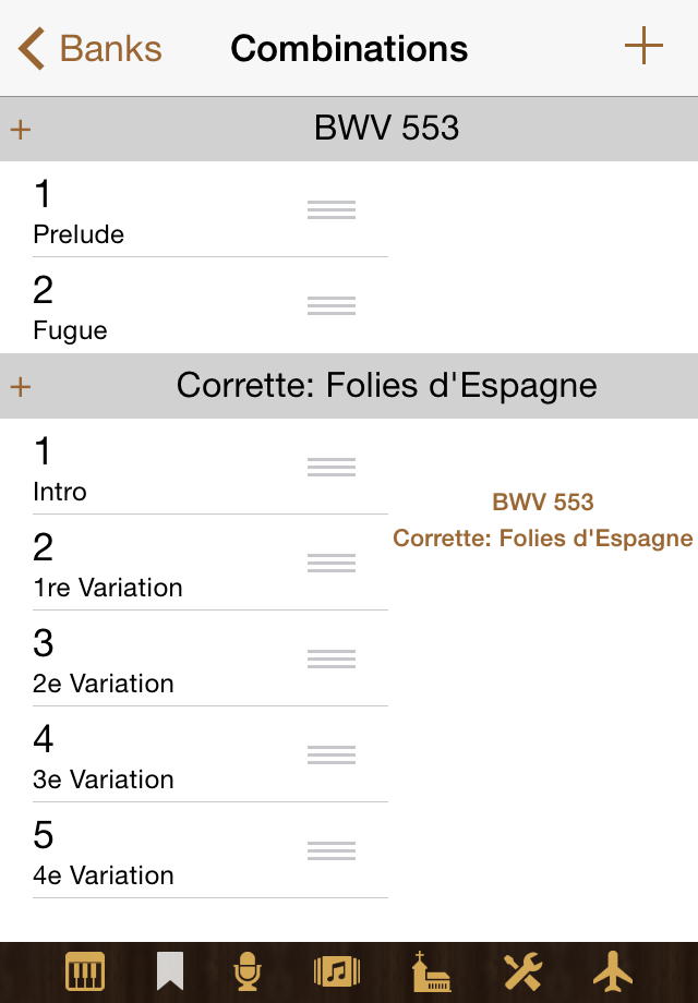 Create a new bank by tapping the + sign at the top right of the view. Add a new combination (corresponding to the current stops selection in the Console view) to a bank by tapping the + sign at the left of the bank name. Long-tap a combination name to duplicate, rename or delete the combination. You can move a combination to another position (in possibly another bank) by dragging (touch and move the grey area at the right of the combination name).