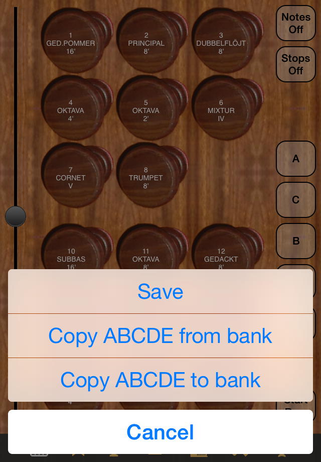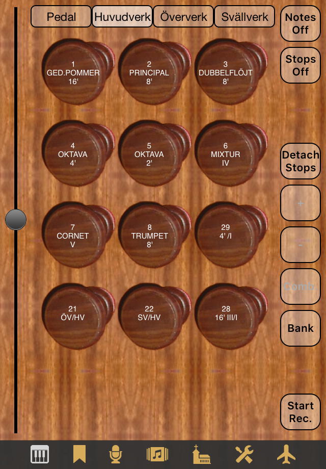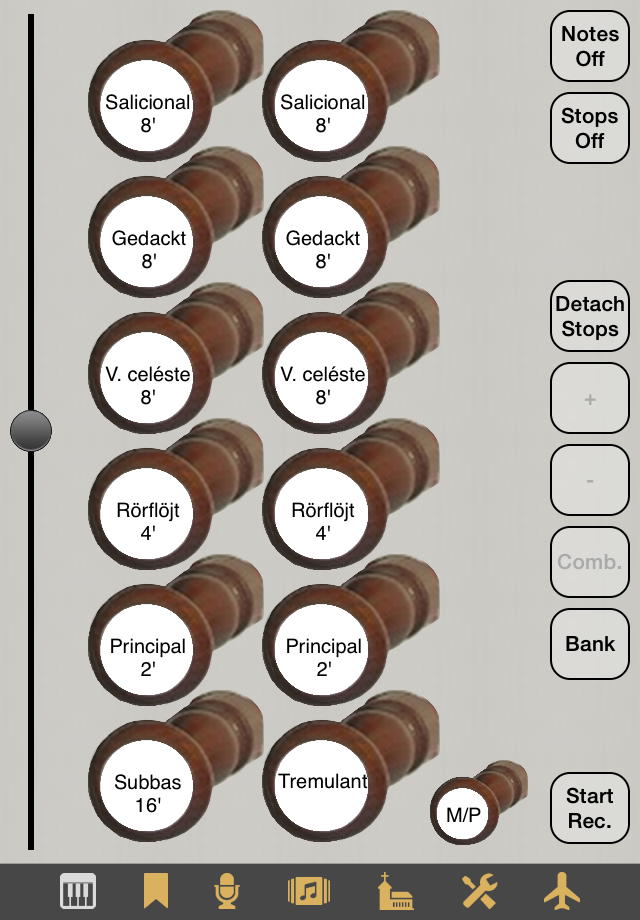 - Detach Stops: After tapping this button, you can operate the stop, coupler and tremulant knobs, but the changes won't take effect until you tap the button (which is then labelled Attach Stops) once again. This allows registration changes during playing, for later use.