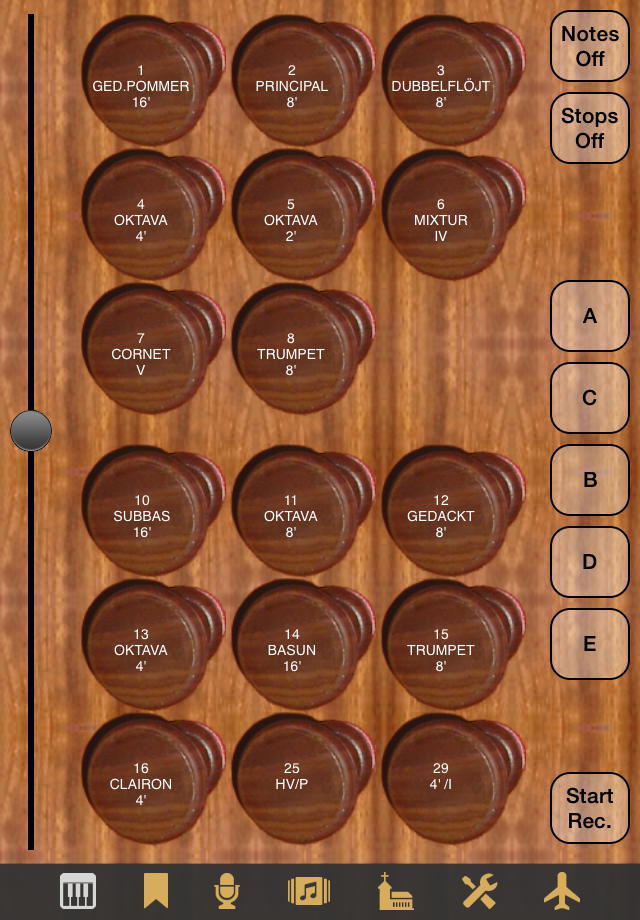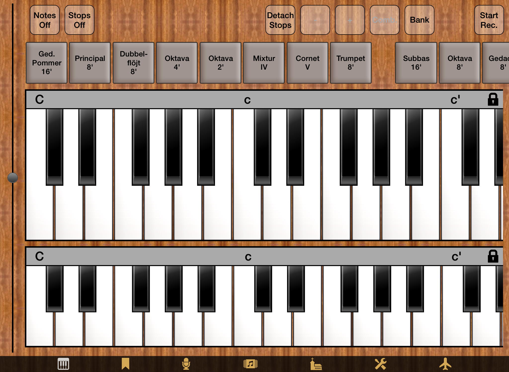 Here, the upper keyboard is the manual, the lower keyboard plays the pedal stops. Both can be scrolled horizontally by dragging the grey strip. The stops can be scrolled, too. The empty space between Trumpet 8' and Subbas 16' is well suited to grab it for scrolling, but you can also drag the stop buttons if you have deactivated Multitasking Gestures in your device settings. This is recommended anyway if you use the virtual keyboards, because otherwise there is the risk to switch apps when you play a chord and move your fingers.