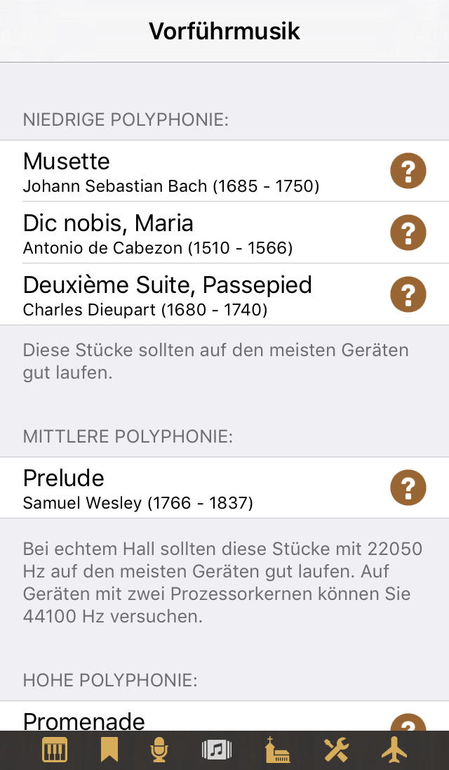 Die Vorführstücke einer Napo-App sind keine Audio-Aufnahmen, sondern Befehle an die App, Noten zu spielen. Es handelt sich mithin um eine Live-Aufführung, bei der Sie sehen, wie sich die Registerzüge in der Spieltisch-Sicht bewegen und die verwendeten Tasten der Bildschirmklaviaturen beobachten können. Überdies können Sie selbst Register wählen, während die Vorführung läuft, oder sogar ein MIDI-Keyboard verwenden, um mitzuspielen.
