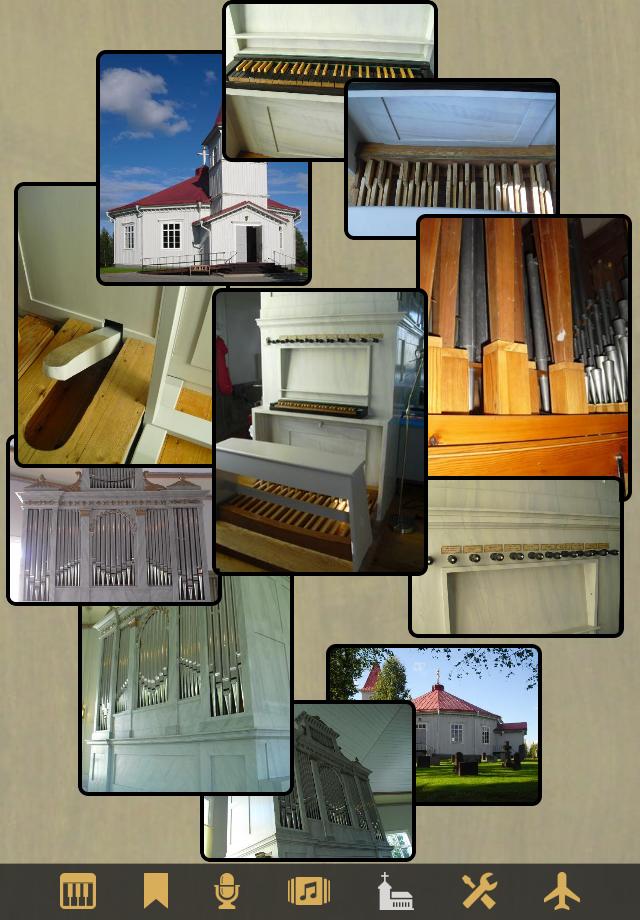 Wenn in der App Bilder der Orgel und vielleicht ihres Standorts enthalten sind, werden diese in der animierten Galerie-Sicht dargestellt. The Galerie-Sicht von StrandOrgan zeigt zum Beispiel Fotos, die Lars Palo zur Verfügung gestellt hat, und sieht so aus: