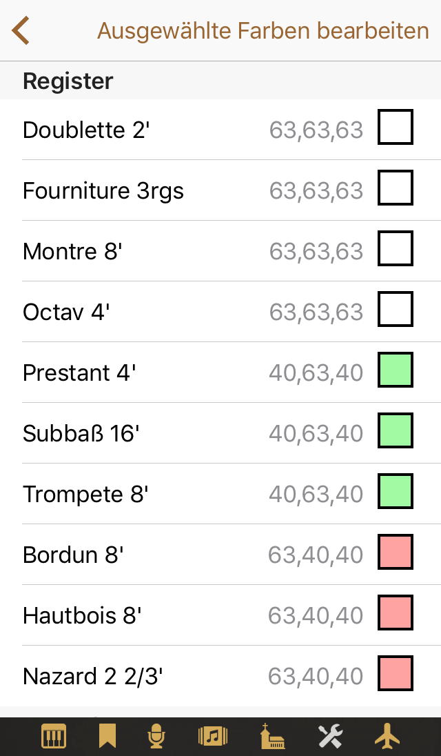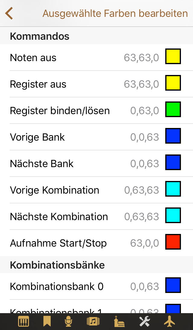 - Die sechs oberen Zeilen (oder die sechs linken Spalten) sind für die Register, Koppeln und Tremulanten. Sie hängen von der App ab.