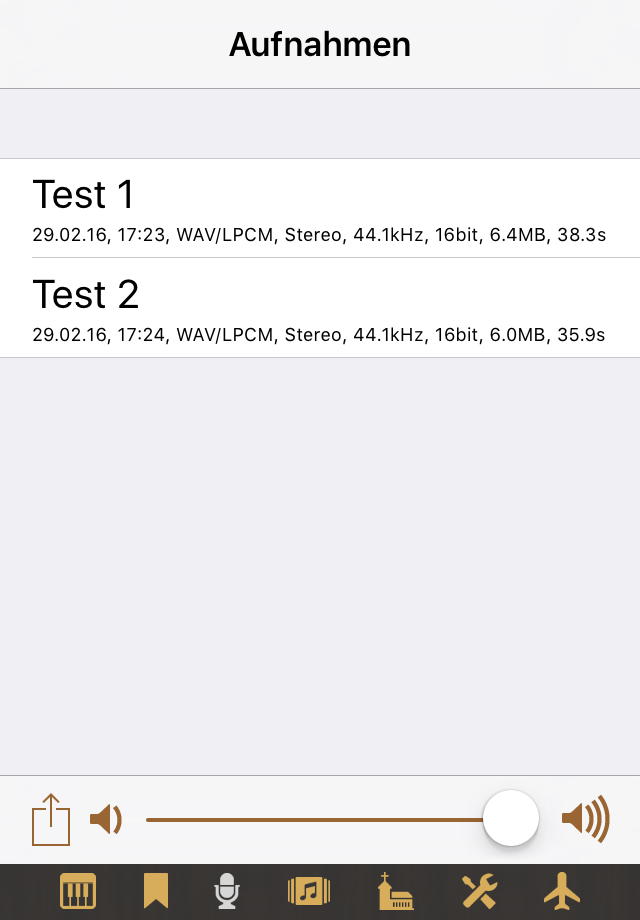 Die Aufnahmen-Sicht wird verwendet, um die Audio-Aufnahmen der App zu verwalten – WAV-Dateien im Dokumentenverzeichnis der App, die über iTunes-File-Sharing oder (ab Napo 4.11) der Dateien-App von iOS 11 zugänglich sind (siehe unten für weitere Möglichkeiten gemeinsamen Zugriffs). Gegenüber Aufnahmen, die Sie durch Mitschneiden des analogen Audio-Signals des Geräts mit einem externen Audio-Rekorder erstellen, sind diese internen Aufnahmen vollständig digital und verlustfrei.