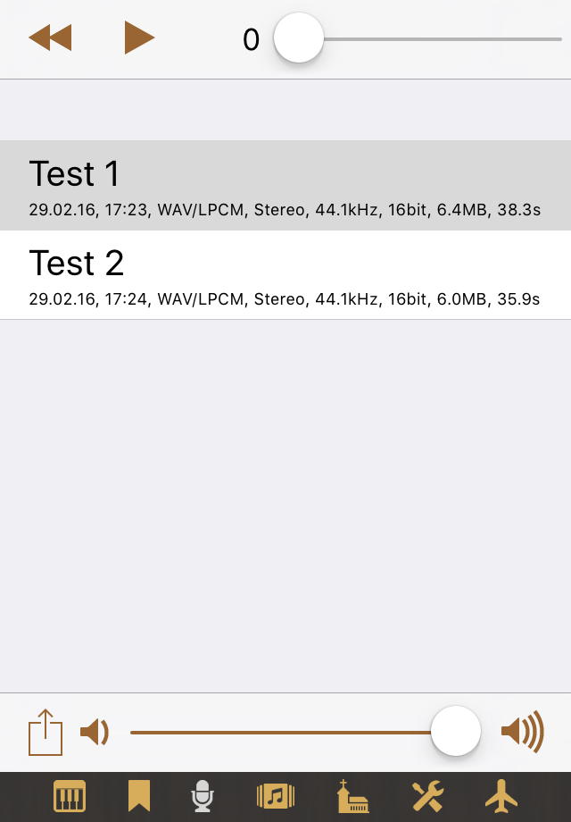 Die Verwendung dieser Knöpfe ist offensichtlich. Der Schieberegler dient zum Anzeigen oder Ändern der Lage innerhalb der Audio-Datei. Sie können auch lange auf die Sekundenanzeige tippen und dann die Sekundenzahl eingeben. Der untere Schieberegler ist für die Wiedergabelautstärke. Das Aktionsmenü links unten erlaubt es Ihnen, alle Aufnahmen zu löschen.