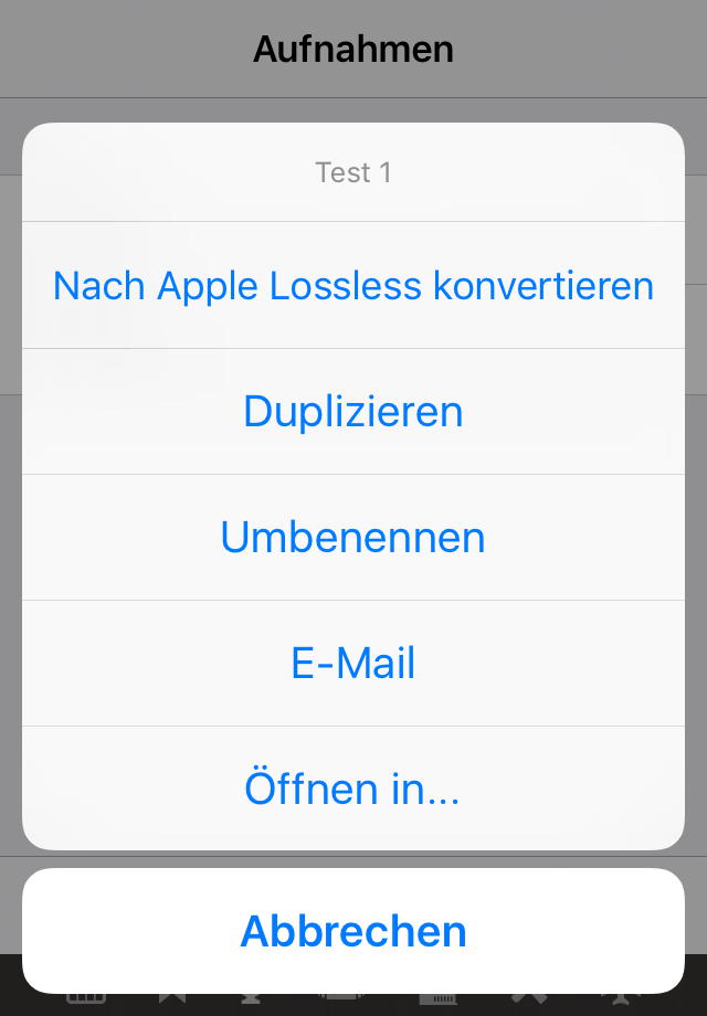 Löschen Sie eine einzelne Datei durch Drüberstreichen. Wenn Sie lange auf eine Audio-Datei tippen, bekommen Sie dieses Aktionsmenü:
