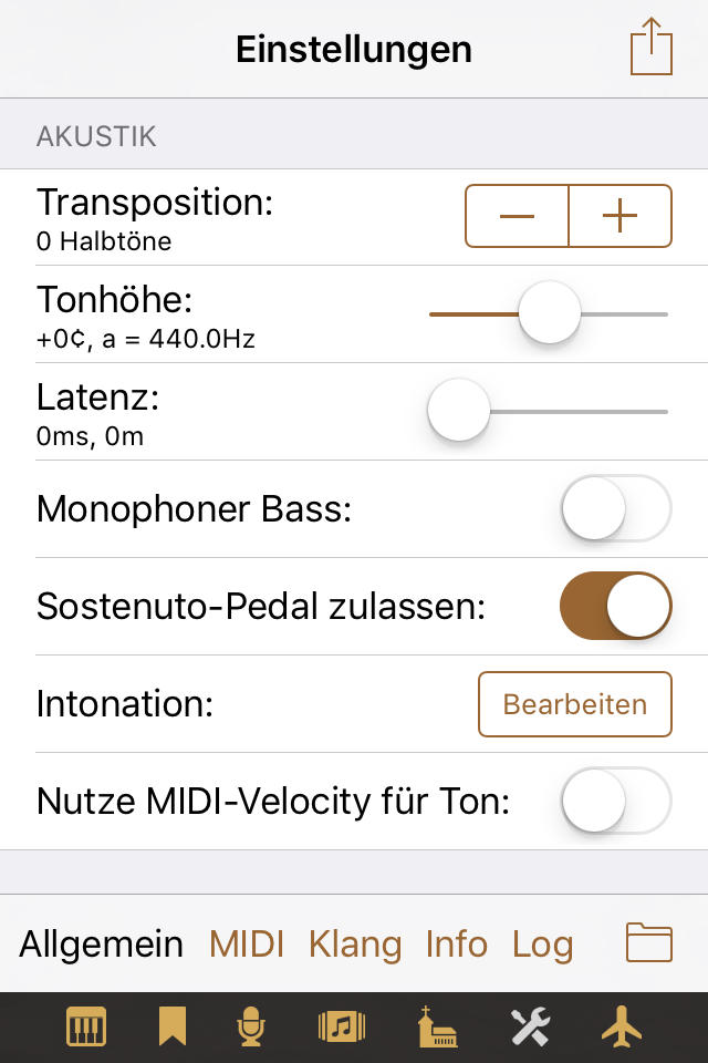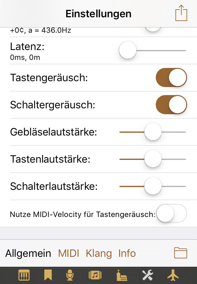 - Latenz: Hier können Sie eine zusätzliche, künstliche Latenz einstellen, die in Millisekunden und durch den entsprechenden Abstand zwischen der Schallquelle und Ihren Ohren angegeben wird. Dies bewirkt, daß der Ton nicht sofort beginnt, wenn Sie eine Taste drücken, sondern erst nach der hier festgelegten Zeit, Der Zweck dieser Einstellung ist, Ihnen zu ermöglichen, für das Spielen an Pfeifenorgeln zu üben, bei denen der Spieltisch in größerer Entfernung zu den Pfeifen steht. Bei einer Schallgeschwindigkeit von 340 m/s entsprechen 100 ms Latenz einem Abstand von 34 m. Innerhalb der App ist diese Funktionalität durch ein künstliches Verzögern der MIDI-Nachrichten verwirklicht. Die Werte, die in der Zeile Latenz angezeigt werden, beinhalten nicht die Latenzen, die durch MIDI, das iOS-Audiosystem und die Audioverarbeitung der App hinzukommen.