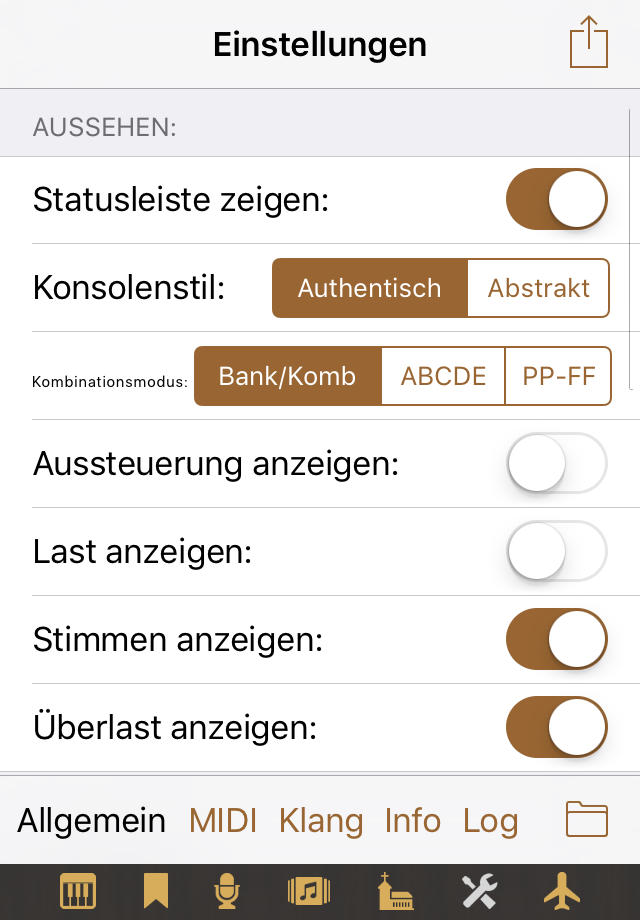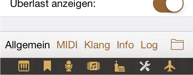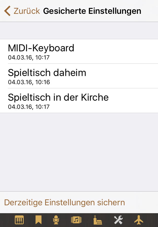 | Speichern/Laden | Diese durch ein Ordnersymbol angedeutete Sicht dient zur Verwaltung gespeicherter Einstellungen. Einstellungen zu speichern und zu laden kann zum Beispiel nützlich sein, wenn Sie die App mit verschiedenen MIDI-Spieltischen verwenden. |
