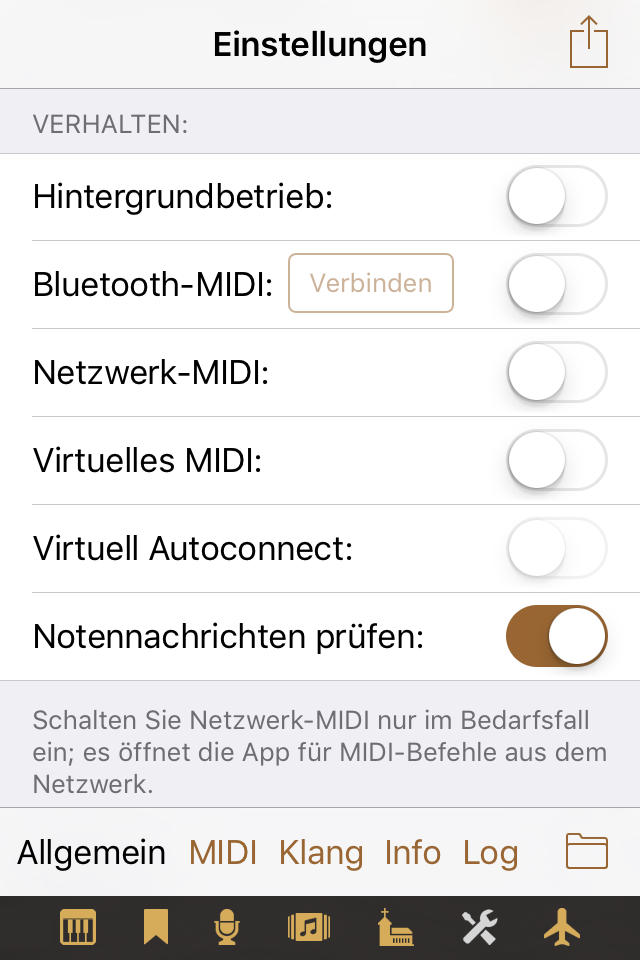 - Hintergrundbetrieb: Gemäß Voreinstellung wird eine Napo-App angehalten, wenn Sie zu einer anderen App wechseln, d.h. ihr Ton wird ausgeblendet und sie beendet die Verarbeitung von MIDI-Ereignissen. Mit diesem Schalter (oder durch langes Drücken des Flugzeugsymbols in der Symbolleiste) können Sie die App dazu bringen, auch im Hintergrund zu laufen. Zum Beispiel können Sie eine andere App als virtuelles Instrument im Vordergrund laufen lassen und beide gleichzeitig spielen. Oder auch den Schalter Virtuelles MIDI einschalten und eine virtuelle Klaviatur oder eine MIDI-Player-App starten, die MIDI-Daten zum virtuellen MIDI-Kanal der Napo-App schickt. Um Energie zu sparen, sollten Sie den Hintergrundbetrieb nicht zulassen, wenn Sie ihn nicht brauchen, auch wenn die App ihre Audio-Sitzung nach 15 Minuten Untätigkeit (keine spielenden Pfeifenstimmen) herunterfährt und anschließend von iOS angehalten wird. In diesem Fall müssen Sie die App in den Vordergrund holen, wenn Sie sie weiter verwenden wollen.