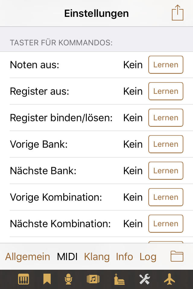 Um die Zuordnung für ein Manual zu erstellen oder zu ändern, tippen Sie auf den Bearbeiten-Knopf rechts vom Manualnamen, und Sie bekommen die MIDI-Zuordnungssicht für dieses Manual: