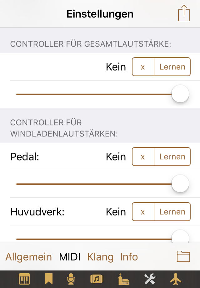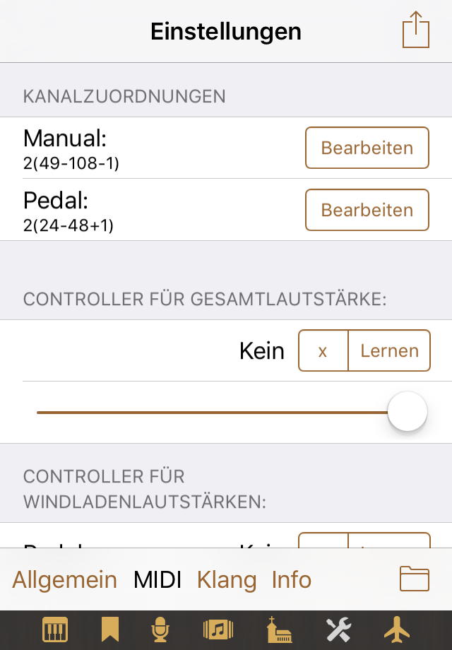 Sie können MIDI-Controller für die Steuerung der Gesamtlautstärke und für die Lautstärken der einzelnen Windladen konfigurieren: