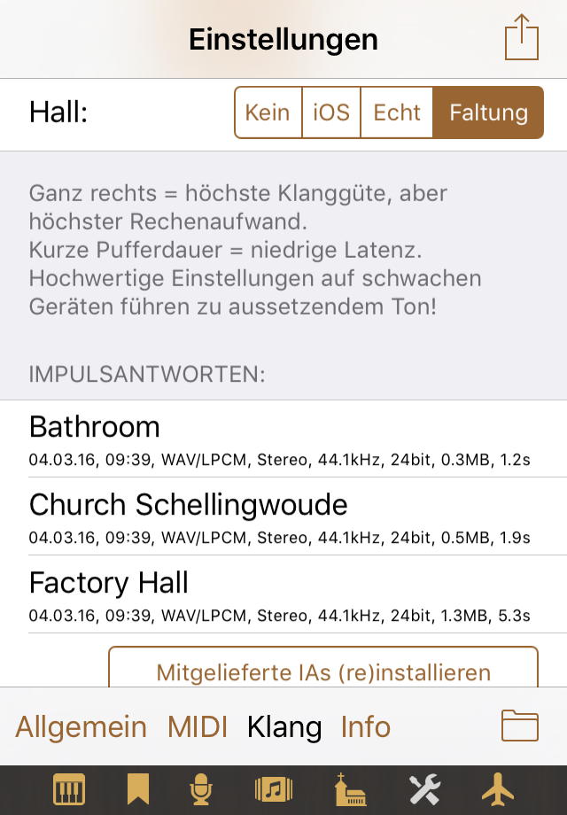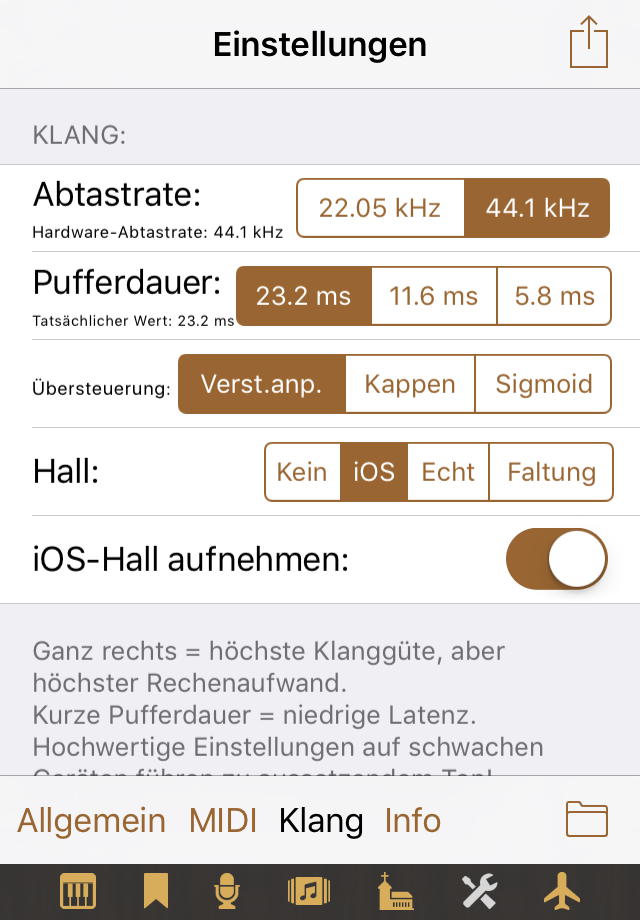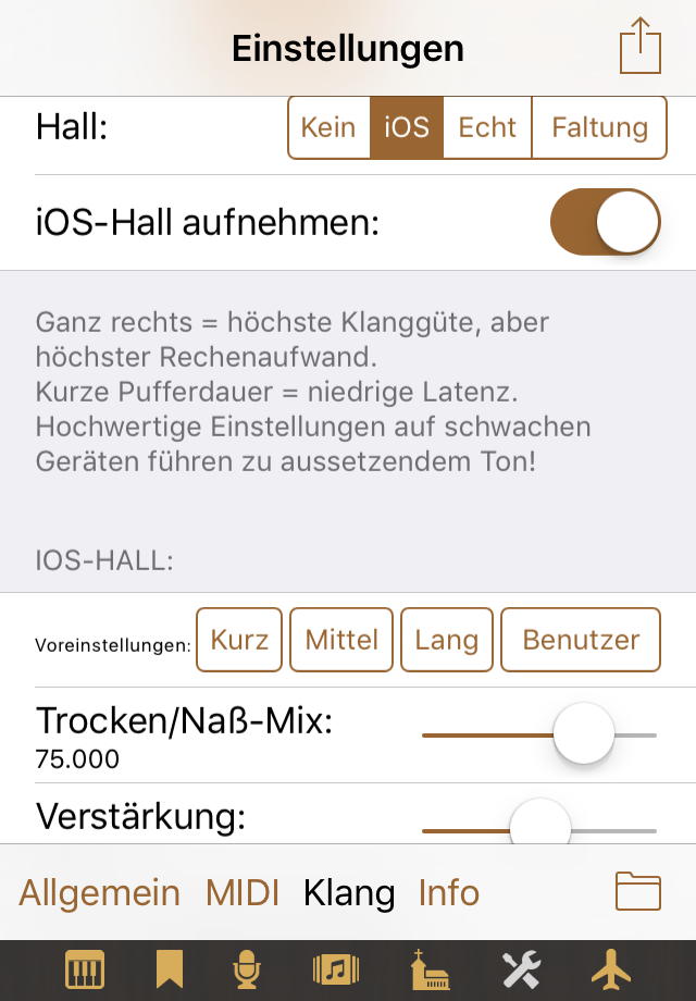 - Hall: Voreingestellt ist iOS, was den Release-Teil der Sample-Dateien abschneidet und iOS den Hall erzeugen läßt. Echt spielt die Samples einschließlich ihres Release-Teils, wofür mehr Rechenleistung gebraucht wird. (Die Bezeichnung Echt ist ein bißchen mißverständlich, weil die Samples selbst schon künstlichen Hall enthalten könnten.) Sie können den Hall ganz ausschalten (Einstellung Kein), wenn Sie eine externe Effekteinheit verwenden möchten oder in einem großen Raum mit dessen natürlichem Nachhall spielen. Eine weitere Möglicheit ist, Napos Faltungshall zu verwenden.