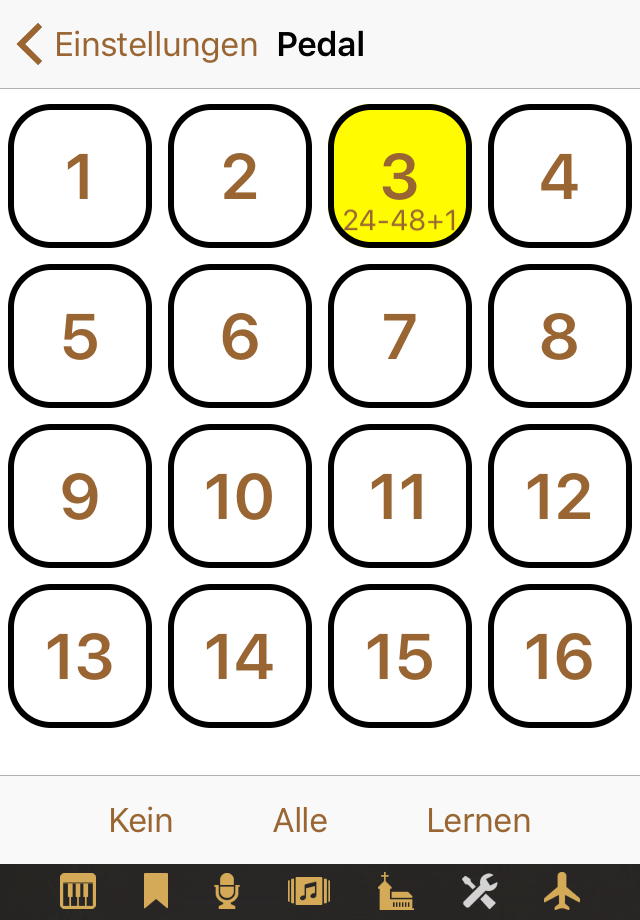 Jeder Kanal, der vom derzeitigen Manual (hier: Pedal) angenommen wird, ist durch eine gelbe Hintergrundfarbe hervorgehoben. Falls der Notenbereich eingeschränkt oder ein Oktavenversatz vorhanden ist, werden die Werte unterhalb der Kanalnummer angezeigt. Es gibt zwei Wege, die Zuordnung einzustellen. Der einfache Weg ist, auf Lernen zu tippen und dann eine Taste (oder zwei Tasten gleichzeitig, um einen Notenbereich zu definieren) auf irgendeinem MIDI-Keyboard, das Sie für das derzeitige Manual benutzen möchten, zu drücken. Tippen Sie Kein, um alle Kanäle auszuschalten und Alle, um alle einzuschalten.