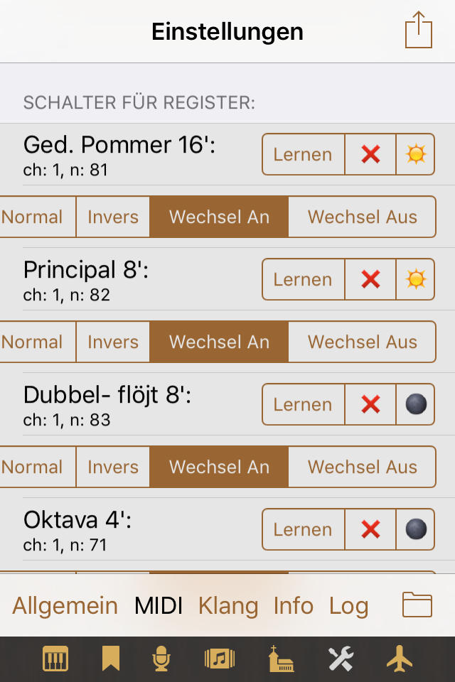 Seit Napo 4.18 ist es möglich, Lämpchen zu Registerschaltern anzusteuern, wenn diese auf die gleichen Note-Nachrichten ansprechen, die die zugehörigen Schalter senden, was z.B. bei einigen Spieltischen von Hoffrichter und Pausch-e der Fall ist. Um diese Steuerung einzuschalten, tippen Sie auf das dunkle Mondsymbol rechts vom roten x. Es wechselt daraufhin zu einem leuchtenden Sonnensymbol. Durch nochmaliges Antippen kann die Steuerung für das jeweilige Register wieder ausgeschaltet werden.