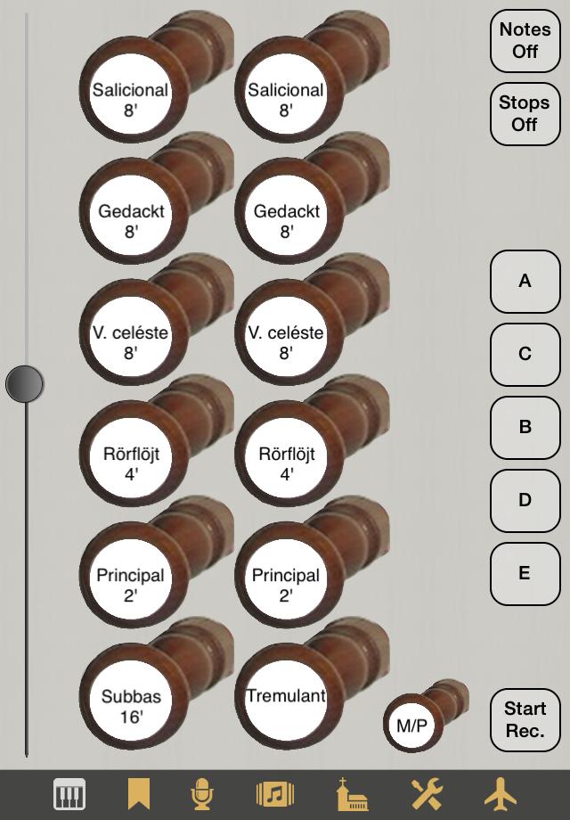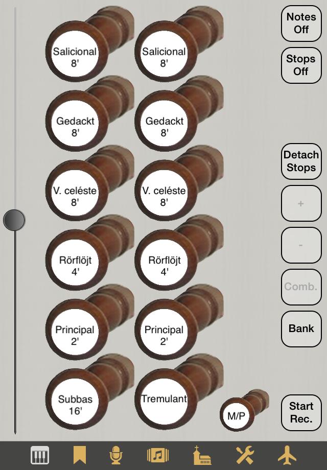 - Detach Stops: After tapping this button, you can operate the stop, coupler and tremulant knobs, but the changes won't take effect until you tap the button (which is then labelled Attach Stops) once more. This allows registration changes during playing, for later use.