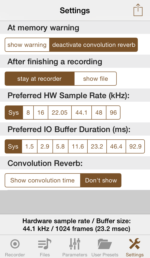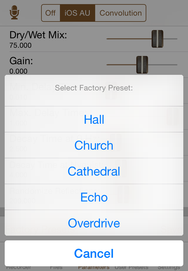 - The Parameters view lets you select the reverb type (iOS Audio Unit reverb or Convolution Reverb) and change the parameters of the reverb. This can be done while audio is playing, so the resulting effect can be heard immediately. When you are happy with the outcome, you can create an audio file with reverb, which you can transfer to other apps for further processing. You can also save the reverb parameters in a user preset. For iOS reverb, there are buttons for loading a preset from a list of factory presets or user presets. Furthermore, there is a button to activate playthrough.
